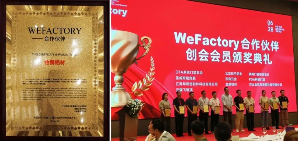 Recently, the «China International (Tianjin) Doors and Windows Industry Partner Exchange Conference,» jointly organized by the China Vision Blue Ocean Doors and Windows Curtain Wall Industry Development Alliance, China Vision Jinjianlian Media, and 30 co-organizing enterprises, was successfully held in Tianjin. Jinpeng Aluminum, as a co-organizing unit, was invited to participate in the conference and was selected as a «WeFactory Founding Partner Member.»