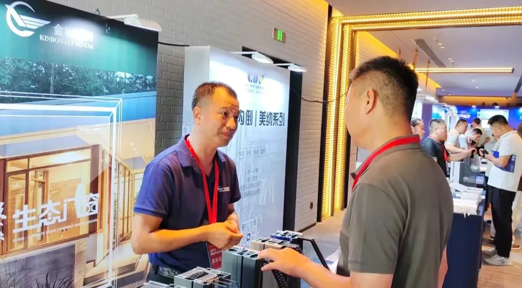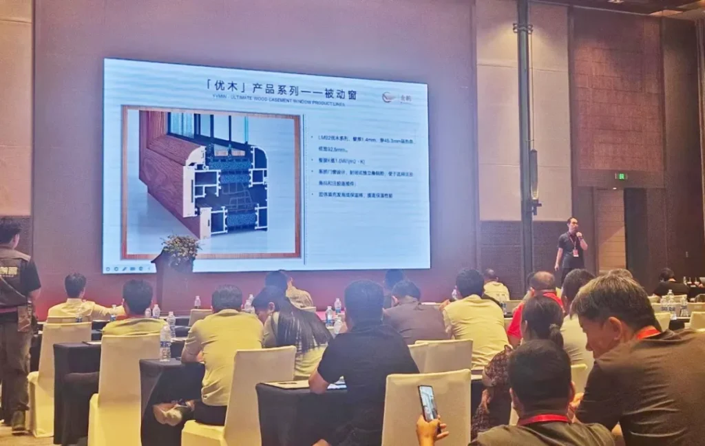 At the conference, Jinpeng Aluminum’s chief engineer gave a presentation on «Jinpeng Premium Wood Eco-Friendly Doors and Windows,» providing a detailed introduction to Jinpeng’s premium wood doors and windows. The premium wood profiles resemble wood but are superior to solid wood, representing a new type of door and window material. They possess the high-end decorative effect and thermal insulation and sound insulation characteristics of wood; they do not crack or deform; they are waterproof, moisture-proof, and free of harmful substances such as formaldehyde and lead; Jinpeng’s premium wood products adopt an integrated molding structure, making processing convenient and offering superior cost advantages. The presentation also specifically introduced the YM92 series passive windows and the YM77 series flush-frame windows, which enrich the application scenarios of Jinpeng’s premium wood doors and windows and meet the personalized needs of users.